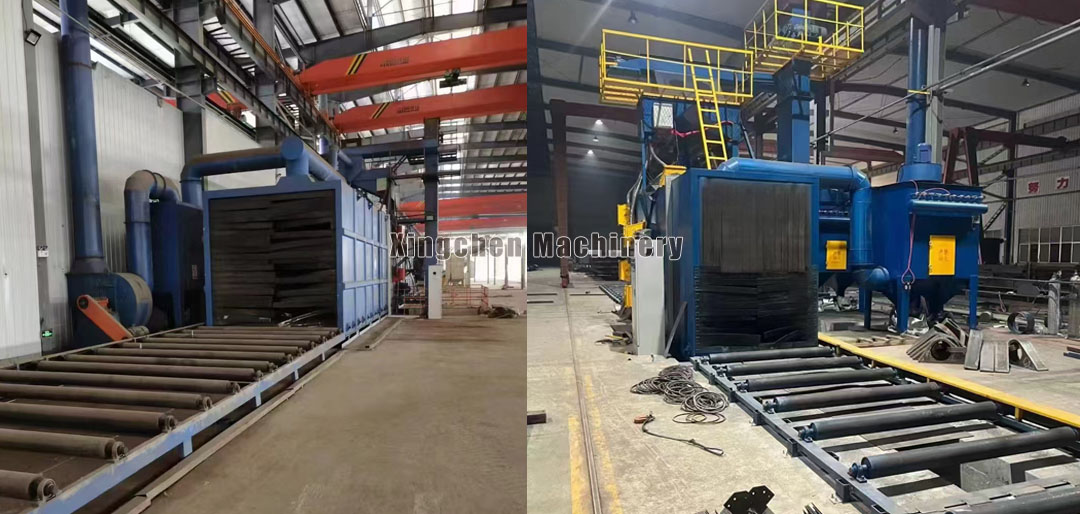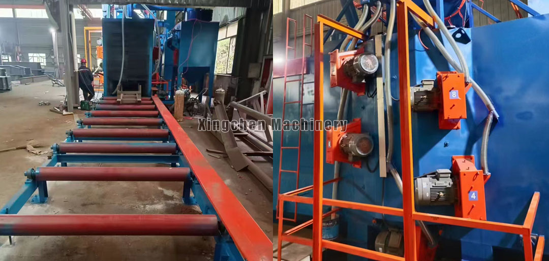 The roller-type shot blasting machine is a new type of specialized equipment designed and manufactured according to user requirements, specifically targeting castings and structural components. It can apply powerful shot blasting to the surfaces of original castings, steel materials, and structural components, removing rust layers, welding slag, and oxide scales, achieving a uniform metallic luster, and eliminating surface stress on the workpieces. At the same time, it improves the coating quality and anti-corrosion effect of steel materials. This equipment mainly utilizes the high-speed rotating impeller of the shot blasting device to accelerate and throw steel shot (projectiles) onto the surface of the workpieces, impacting and scraping the workpieces to remove rust layers, oxide scales, and contaminants on the surface, achieving a certain degree of roughness; correspondingly improving the corrosion resistance and surface quality of the products; improving and enhancing the appearance quality and inherent quality of the products, greatly reducing the labor intensity and environmental pollution of the cleaning work.