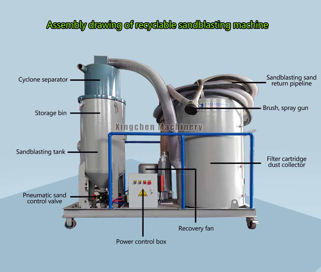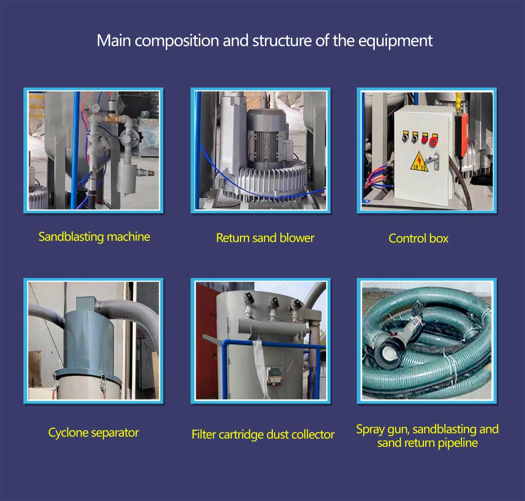 This equipment utilizes compressed air as the power source to spray abrasives at high speed onto the surface of the workpiece. Through the impact of the abrasives, rust and dirt on the surface of the workpiece are removed, achieving a certain level of cleanliness and roughness on the surface. Compressed air then generates negative pressure to recycle sand and dust. The complete abrasives are separated and recycled through the sand and dust separation system of the equipment. Dust and rust enter the dust removal bucket. Under the control of a single switch, all actions of the equipment, including sandblasting, sand return, sand and dust separation, sand recycling, and dust filtration, are automatically completed. The working environment is clean and pollution-free, meeting the air and dust hygiene standards of the workshop.