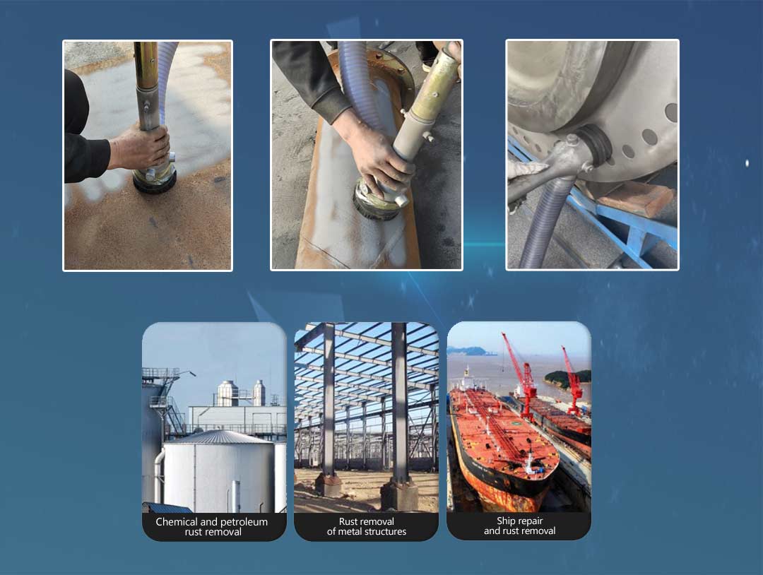 It is suitable for pre-treatment applications such as removing toxic paint from ship hull ballast tanks, dust-free sandblasting and rust removal in dock tanks, rust removal in oil storage tanks, sandblasting of wind turbine towers, bridge corrosion prevention, and water conservancy project gates. It is an ideal cleaning equipment for repairing shot blasting machines, sandblasting rooms that miss workpieces, and large steel plates, I-beams, stainless steel parts, and other metal structural components before surface coating to remove rust, oxide scale, paint, dirt, and strengthen the surface.