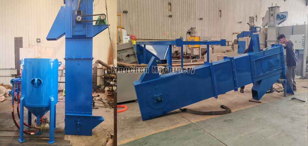 The bucket elevator consists of a cycloidal pin wheel reducer, upper and lower drums, conveyor belt, hopper, enclosed casing, and tensioning device. The inlet of the bucket elevator is connected to the screw conveyor, and its outlet is connected to the separator. The elevator casing is equipped with a maintenance door for repairing and replacing the lifting hopper. Opening the door cover on the lower casing allows for maintenance of the lower transmission and removal of blockages caused by shot at the bottom. This machine uses a flat belt for rotation. During operation, the hopper fixed on the conveyor belt scrapes up the shot material at the bottom of the elevator, and then, driven by the elevator motor, transports the shot material to the top of the elevator. Finally, it falls by centrifugal gravity, feeding the shot material into the shot-sand separator. The drive transmission chain adopts a sleeve roller chain, effectively ensuring the reliability of lifting. The receiving interface for the falling material is made of special materials.